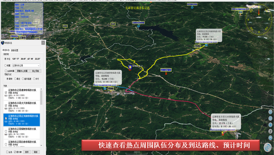 自動(dòng)計(jì)算、統(tǒng)計(jì)熱點(diǎn)附近的隊(duì)伍,取水點(diǎn)、道路山形、林業(yè)資源等,自動(dòng)計(jì)算前行路線(xiàn),自動(dòng)預(yù)計(jì)到達(dá)時(shí)間,指揮中心匯聚多方信息在高清三維GIS圖上,供決策使用。