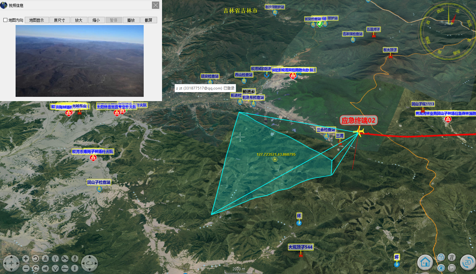 GIS平臺(tái)顯示拍照所在位置及照片中心指向方位線(xiàn),調(diào)用重載云臺(tái)攝像機(jī)查看火點(diǎn),然后通過(guò)交叉定位即可準(zhǔn)確定位火點(diǎn)。